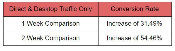 To check the success of the overall checkout page we created filters so that only direct traffic and desktops views would be counted. When we did this we noticed that our conversion rate had increased by a significant 31–54% over 2 weeks.